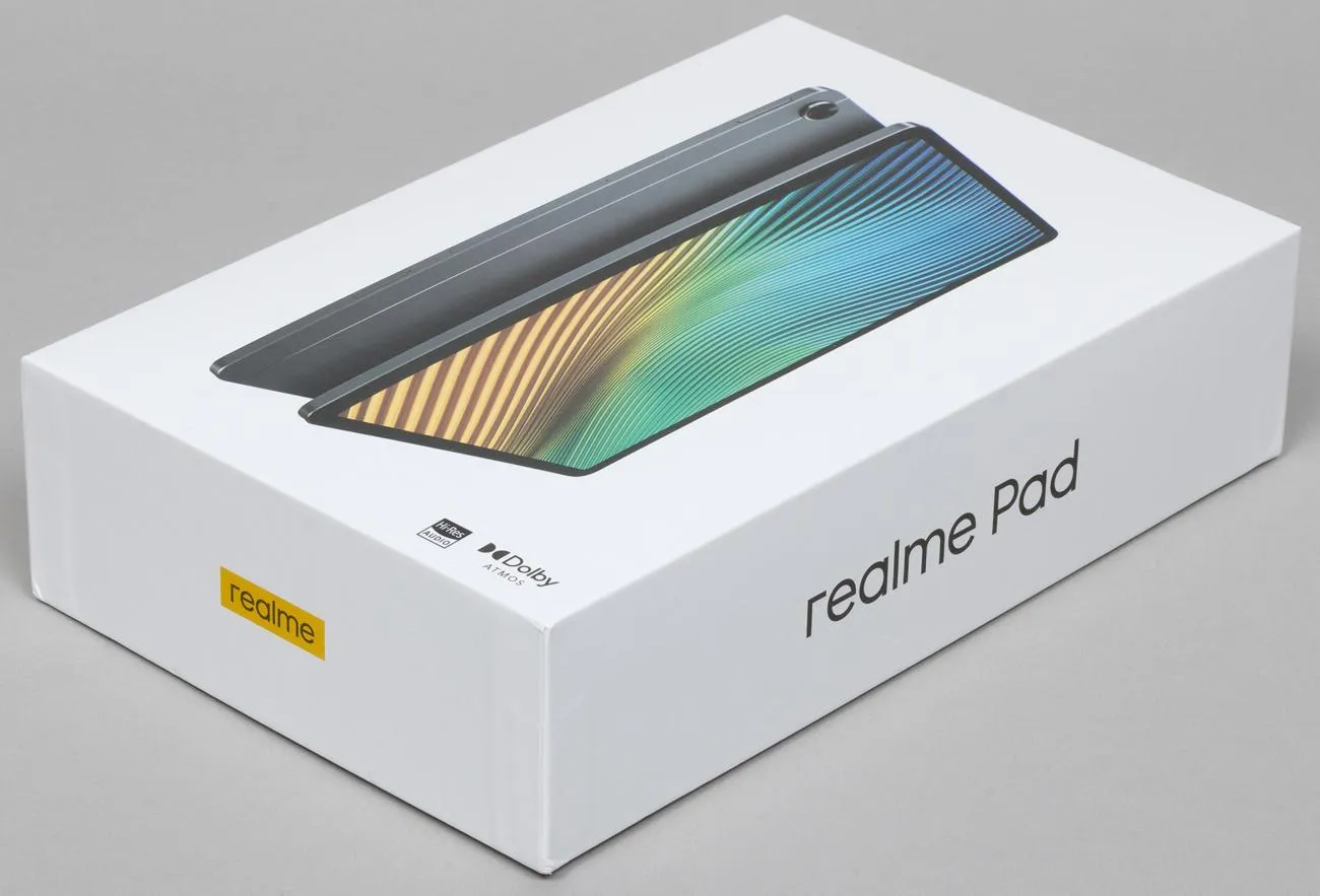 Упаковка Realme Pad выглядит стандартно для подобных устройств и напоминает iPad: белая прямоугольная коробка, минимум надписей, на фронтальной поверхности — изображение самого планшета.